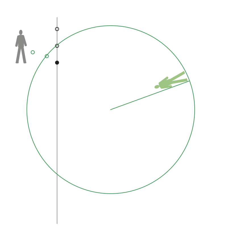 Boll far förbi rymdstationen längs en rät linje. Bollens bana i absoluta rummet är markerad med en svart linje. Bollens bana relativt rymdstationen framgår av de gröna ringarna.