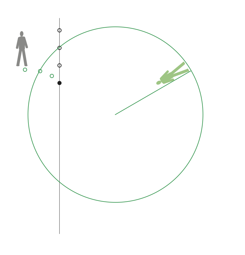 Boll far förbi rymdstationen längs en rät linje. Bollens bana i absoluta rummet är markerad med en svart linje. Bollens bana relativt rymdstationen framgår av de gröna ringarna.