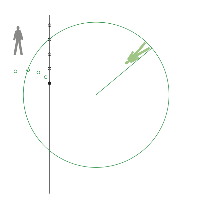 Boll far förbi rymdstationen längs en rät linje. Bollens bana i absoluta rummet är markerad med en svart linje. Bollens bana relativt rymdstationen framgår av de gröna ringarna.