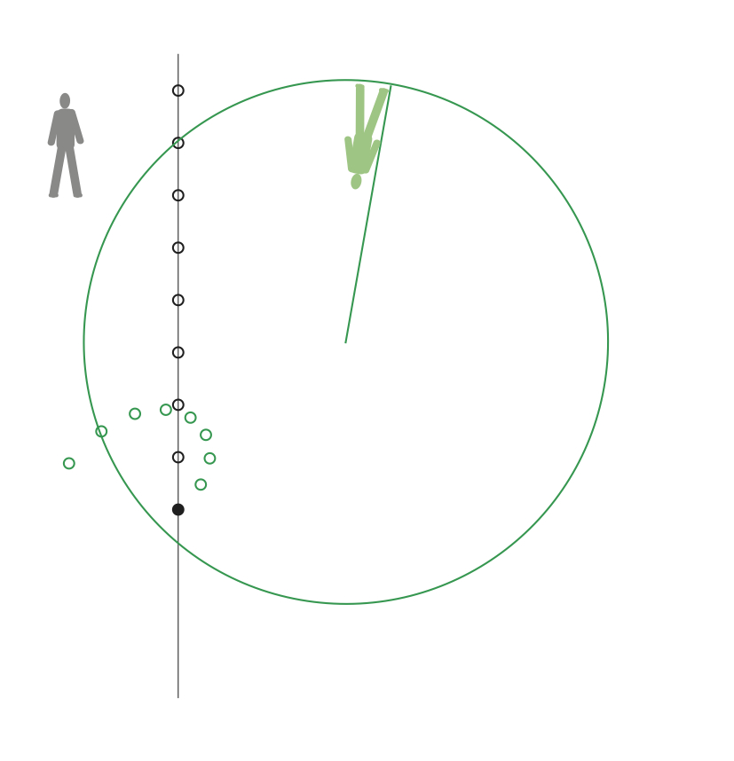 Boll far förbi rymdstationen längs en rät linje. Bollens bana i absoluta rummet är markerad med en svart linje. Bollens bana relativt rymdstationen framgår av de gröna ringarna.