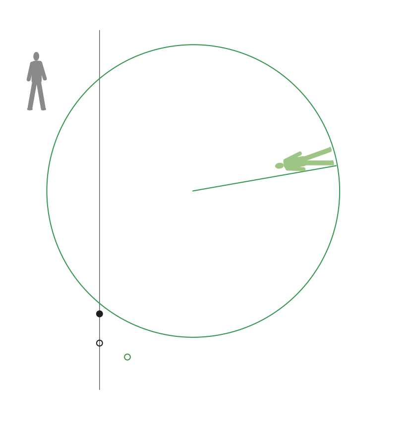 Boll far förbi rymdstationen längs en rät linje. Nu låter vi bollen gå åt andra hållet. Bollens bana i absoluta rummet är markerad med en svart linje. Bollens bana relativt rymdstationen framgår av de gröna ringarna.