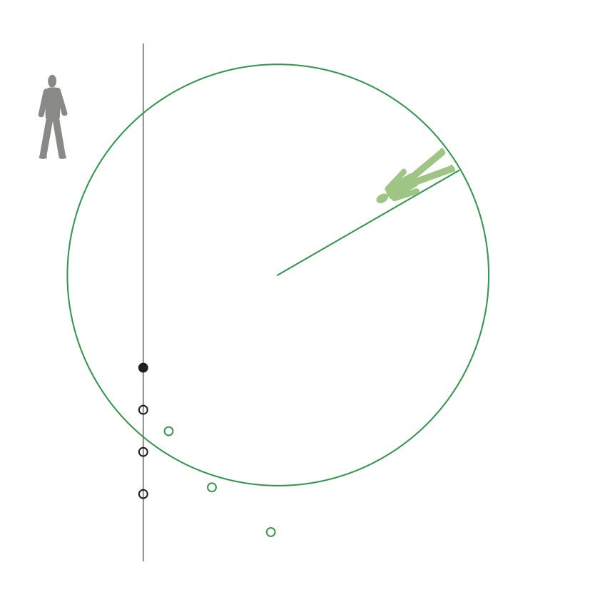 Boll far förbi rymdstationen längs en rät linje. Nu låter vi bollen gå åt andra hållet. Bollens bana i absoluta rummet är markerad med en svart linje. Bollens bana relativt rymdstationen framgår av de gröna ringarna.