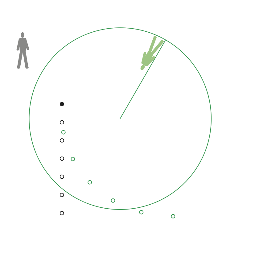 Boll far förbi rymdstationen längs en rät linje. Nu låter vi bollen gå åt andra hållet. Bollens bana i absoluta rummet är markerad med en svart linje. Bollens bana relativt rymdstationen framgår av de gröna ringarna.