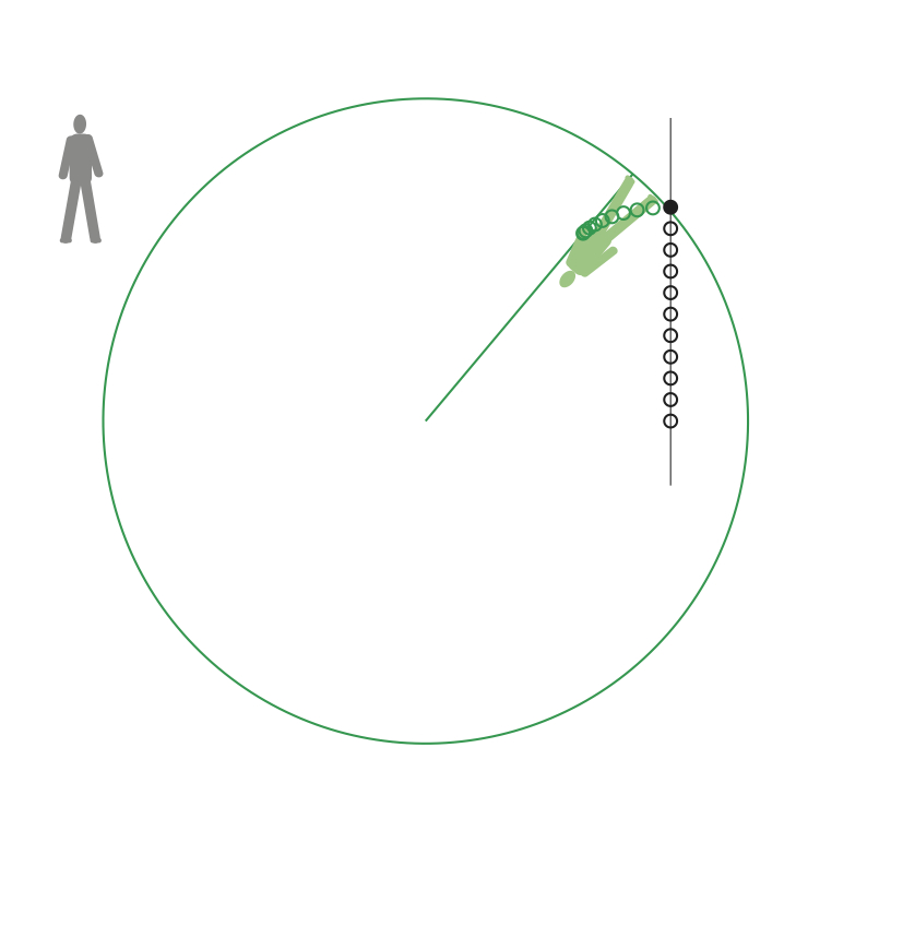 Om en person i rymdstationen släpper en boll kommer den att röra sig längs
