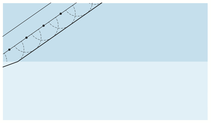 Bildserien visar hur en plan våg bryts vid passage av en gränsyta.