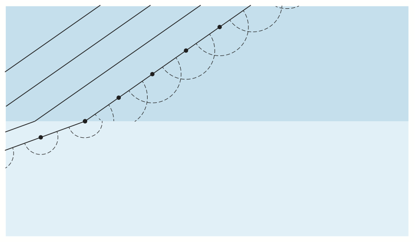 Bildserien visar hur en plan våg bryts vid passage av en gränsyta.