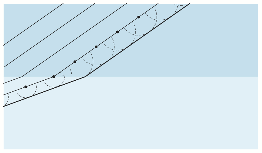 Bildserien visar hur en plan våg bryts vid passage av en gränsyta.