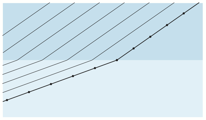 Bildserien visar hur en plan våg bryts vid passage av en gränsyta.