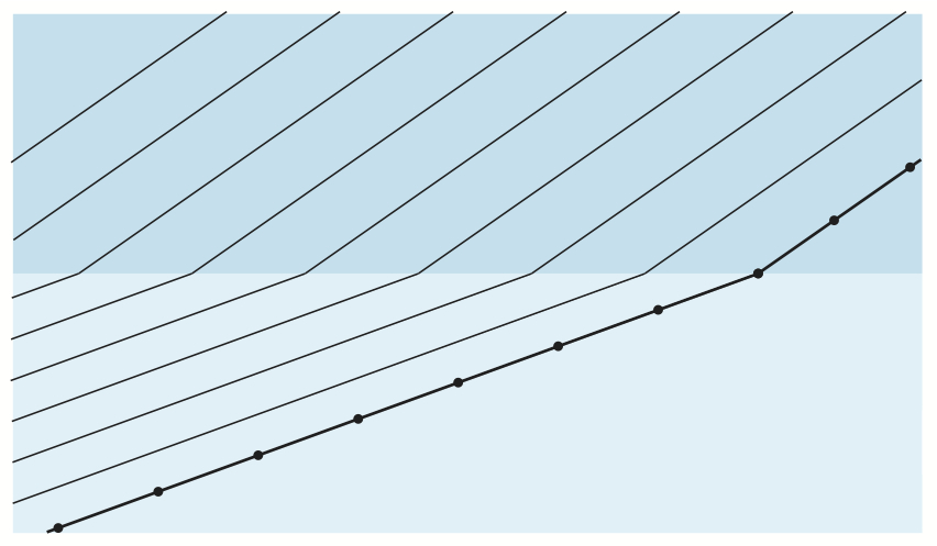Bildserien visar hur en plan våg bryts vid passage av en gränsyta.