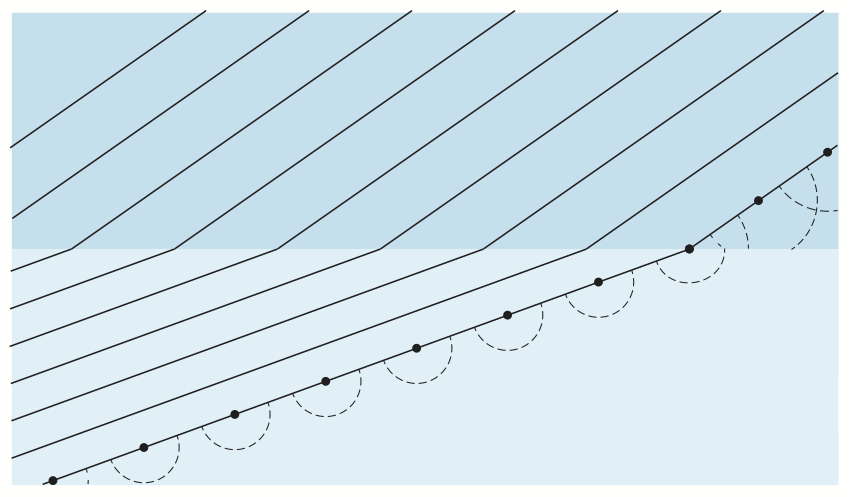 Bildserien visar hur en plan våg bryts vid passage av en gränsyta.