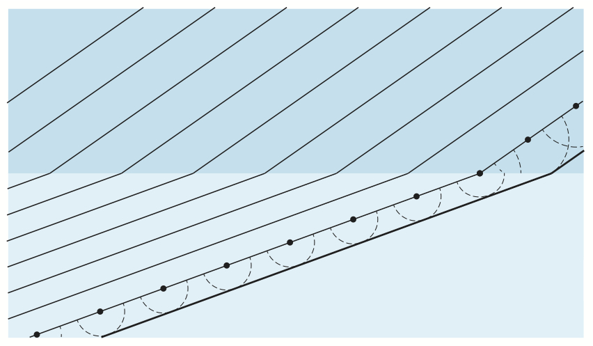 Bildserien visar hur en plan våg bryts vid passage av en gränsyta.