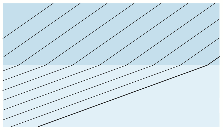 Bildserien visar hur en plan våg bryts vid passage av en gränsyta.