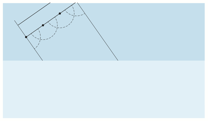 Bildserien visar hur en (del av en) plan våg reflekteras mot en gränsyta.