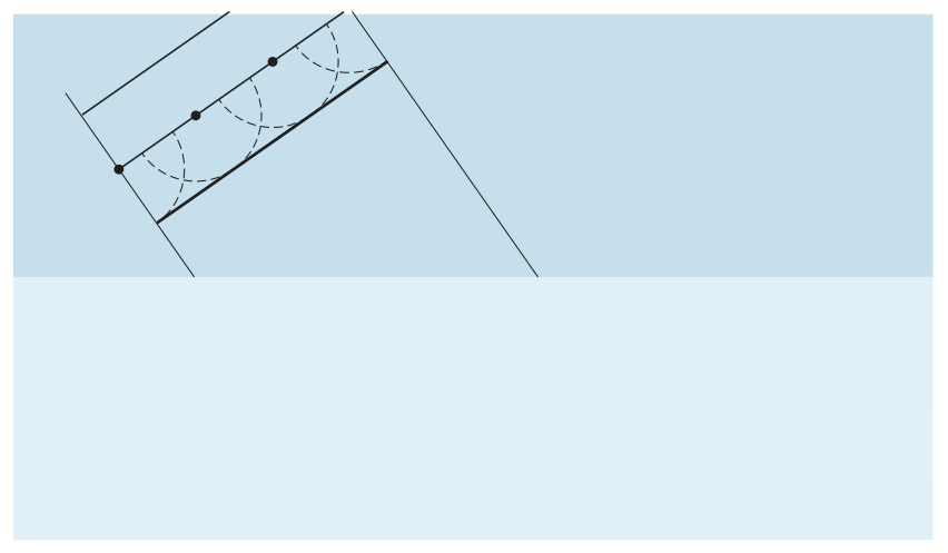 Bildserien visar hur en (del av en) plan våg reflekteras mot en gränsyta.