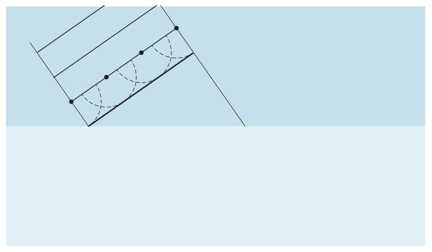 Bildserien visar hur en (del av en) plan våg reflekteras mot en gränsyta.