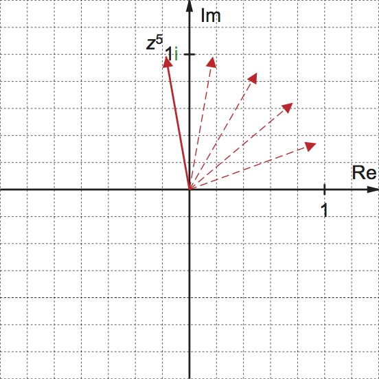 Nedan visas en vektor i komplexa talplanet som representerar zn, n = 1, 2, 3, 4, 5, 6 då z = 1 (cos 20° + i sin 20°)