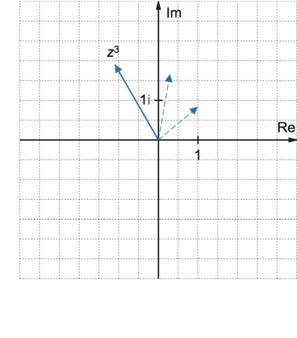 Nedan visas en vektor i komplexa talplanet som representerar zn, n = 1, 2, 3, 4, 5, 6 då z = 1,3 (cos 40° + i sin 40°)