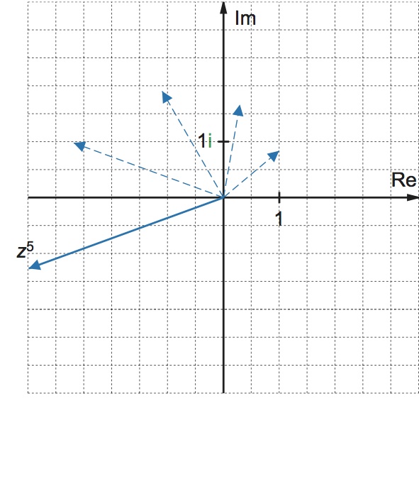 Nedan visas en vektor i komplexa talplanet som representerar zn, n = 1, 2, 3, 4, 5, 6 då z = 1,3 (cos 40° + i sin 40°)