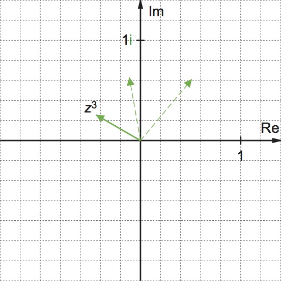 Nedan visas en vektor i komplexa talplanet som representerar zn, n = 1, 2, 3, 4, 5, 6 då z = 0,8 (cos 50° + i sin 50°)