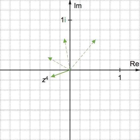 Nedan visas en vektor i komplexa talplanet som representerar zn, n = 1, 2, 3, 4, 5, 6 då z = 0,8 (cos 50° + i sin 50°)